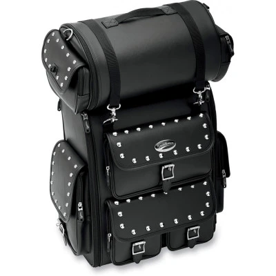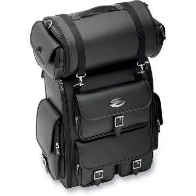 The Saddlemen EX2200/2200S Deluxe Sissy Bar Bag is constructed with a UV-resistant leather-grain Saddlehyde surface to provide a stylish, appealing design to match your saddlebags and seats. This sissy bar bag can be mounted via the adjustable mounting system that goes on in seconds and, once adjusted, never needs to be adjusted again. The EX2200 and EX2200S Deluxe Sissy Bar Bag also features a full-side opening, multiple storage pouches, internal adjustable shelf, and an included roll bag and raincover.