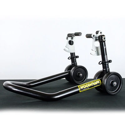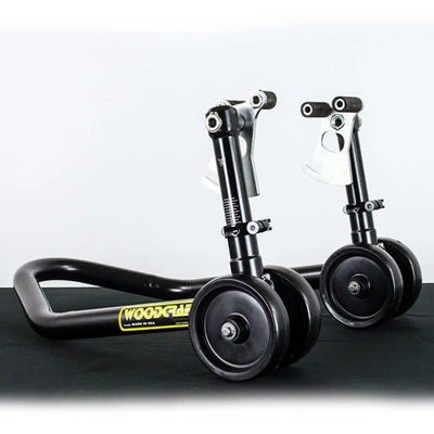 The Woodcraft Under Fork Adjustable Front Stand is perfect for tire changes, brake maintenance and tire warmer use at the race track. The adjust-ability it offers allows you to dial in the lifting effort so it requires less effort to list. This motorcycle stand is designed by a motorcycle racer for motorcycle racers.