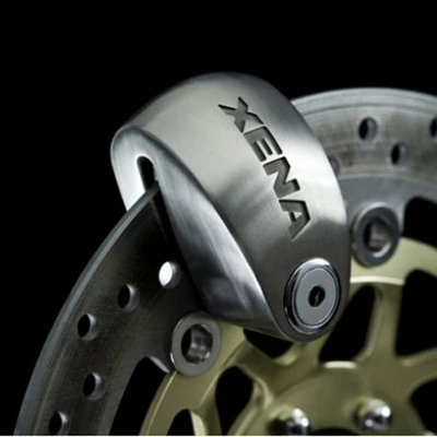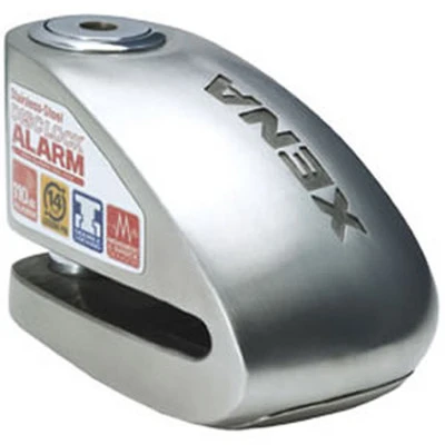 The Xena XX10 Disc Lock Alarm uses a high nickel-content stainless-steel mono-block body, broad fit profile and best-in-class 10mm double-locking, carbide-reinforced hardened-steel locking pin. Freeze-spray proof, pick-resistant. Shock and motion sensors trigger a piercing 120dB alarm. A single CR2 long-life Lithium battery lasts up to a year. Self-arming, no on-off switch, re-sets to armed mode in 15 seconds. Removable alarm module for easy service/battery changes.